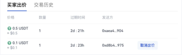 若在您选择的过期时间内,卖家选择与您交易,你便会成功购买此NFT;若在您选择的过期时间结束时,卖家没有选择与您交易,您的出价单会自动撤销。若在您选择的过期时间内,其他买家以标价直接购买此NFT,您的出价单也会自动撤销。3、出价后,您可以在页面下方【买家出价】中查看所有出价,若不想进行出价购买,可以点击【取消出价】按钮进行撤单。
