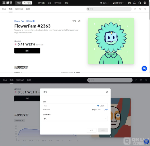 (1)出价拍卖:若NFT页面显示【出价】,您可以进行出价拍卖。 点击【出价】,如未连接钱包需进行钱包链接的操作,之后输入您愿意购买此NFT的数量、单价,以及过期时间。