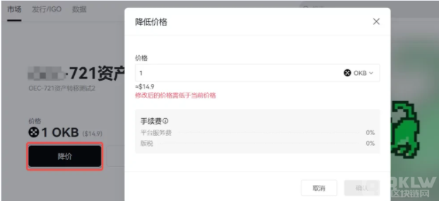 5、如果您想修改这个上架的NFT价格和数量信息,在该NFT详情页,点击【降价】,在弹窗中修改相应信息并确认即可。
