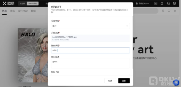 2、选择文件类型(本平台支持创作图片、视频、音频型NFT),上传您的NFT作品,并对作品进行命名和描述。您可以自行设置每一次交易获得的版税比例,设置完成后点击【创作】。