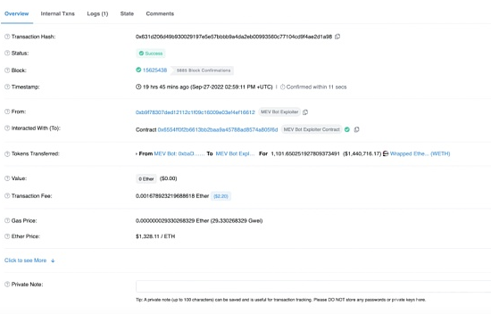 2022年9月27日,MEV机器人(0xBAD..)被攻击利用,造成了1,463,112.71美元的资产损失。