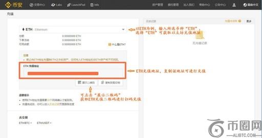 以ETH为例,输入所选币种“ETH”,选择“ETH”可获取ETH充值地址,复制该地址可进行充值或通过点击“展示二维码”进行扫码充值。